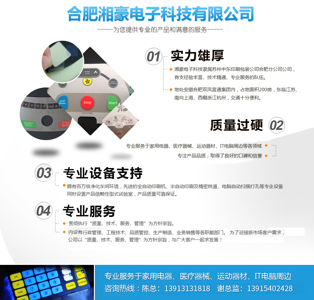 公司簡介 合肥湘豪電子科技有限公司系香港中意國際集團股份有限公司(1998年創建)下屬企業,關系企業有:東莞中意塑膠制品有限公司(1996年創建),蘇州中意塑膠制品有限公司(2003年創建),蘇州中東包裝印刷有限公司(2007創建),蘇州捷瑞達自動化科技有限公司(2014年創建),東莞唯道實業有限公司(2014年創建),合肥六九機器人自動化科技有限公司(2015年創建);合作企業有:香港富通工業集團。 公司總部設在經濟發達的香港,總公司這十幾年來先后在東莞,蘇州投資設廠,為滿足合肥市場廣大客戶的需求,總公司于2015年與香港富通工業集團合作在合肥投資設廠,打造電器控制面板,薄膜開關業界的航空母艦,創造專業產品,樹立精品觀念,鍛造高品質、高服務的企業形象,樹立正確的核心價值觀。全心全意為國內外品牌企業服...榮譽資質